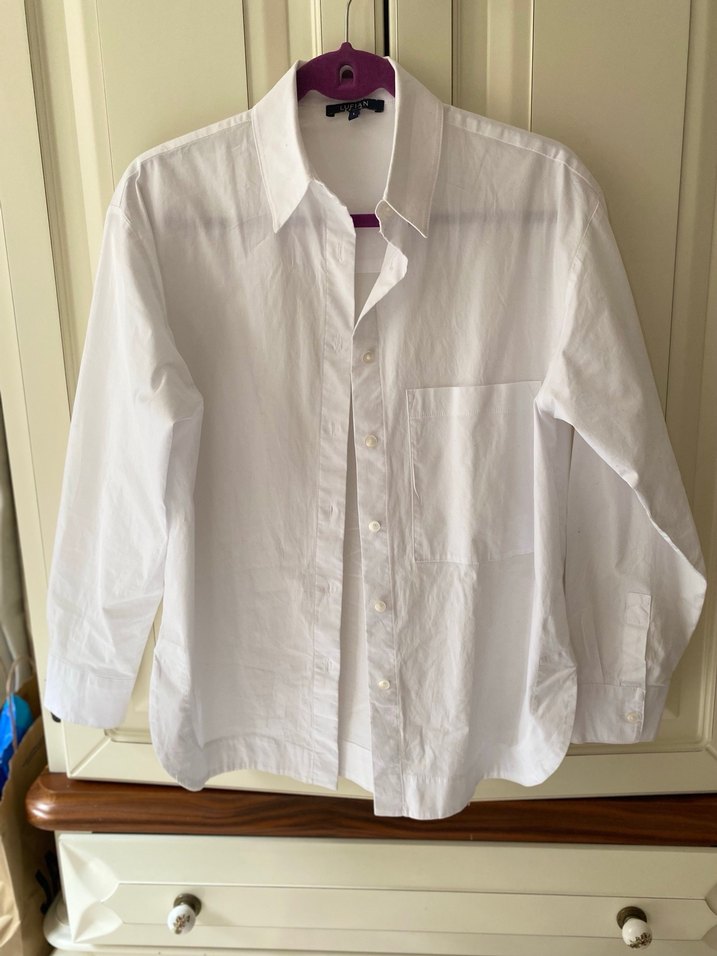 Düğmeli, beyaz keten kumaştan, yakalı ve uzun kollu, salaş kesim kadın gömleği. M beden giyenler tercih etse daha iyi olur, owersize giyimde daha hoş durur.