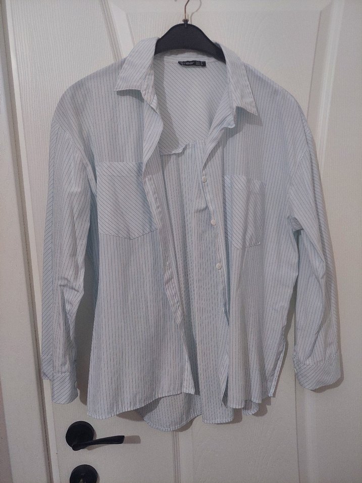 Beyaz keten kumaştan, uzun kollu ve düğmeli, bol kesim günlük kadın gömlek. Midi boyda, yakalı ve desen içermeyen rahat bir tasarım. bel kısmında hafif leke var ama pantolon içine falan koyunca ya da normal de çok belli olmuyor Bol bi model