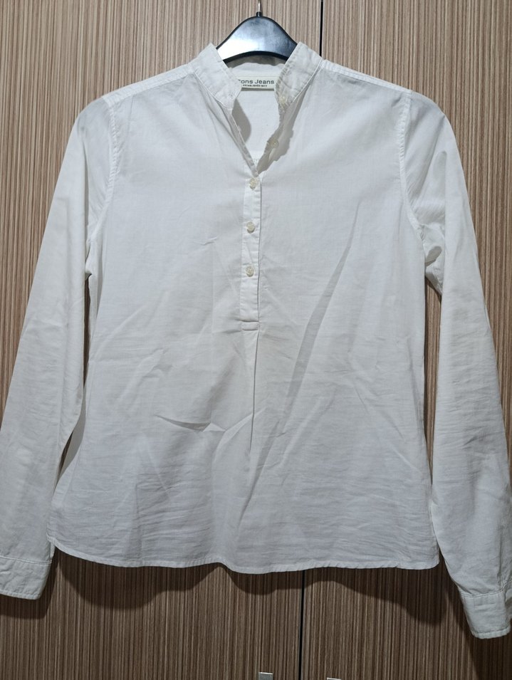 Düğmeli ön kısmı, yakalı ve uzun kollu beyaz keten kadın gömleği. Normal midi boyda, sade ve minimalist tarzda, günlük kullanım için uygundur.