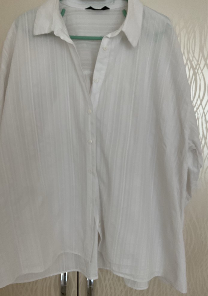 Beyaz keten kumaştan, düğmeli ve yakalı, kısa kollu bol kesim kadın gömleği. Minimalist tarz için uygundur.
