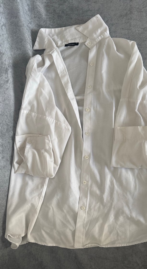 Düğmeli önü, yakalı ve uzun kollu beyaz keten kadın gömleği. Rahat kesimi ve minimal tarzıyla günlük kullanıma uygundur.
