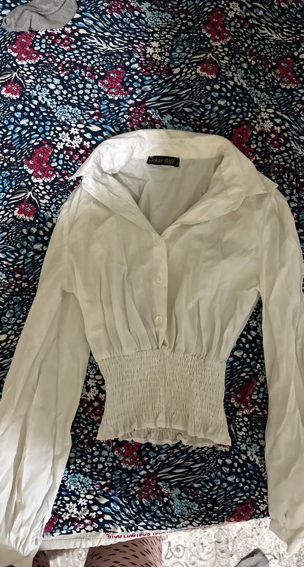 Uzun kollu, düğmeli beyaz keten kadın gömleği. Yakalı ve bel kısmı büzgülü, midi boyda, bohem tarzda günlük kullanım için uygun.