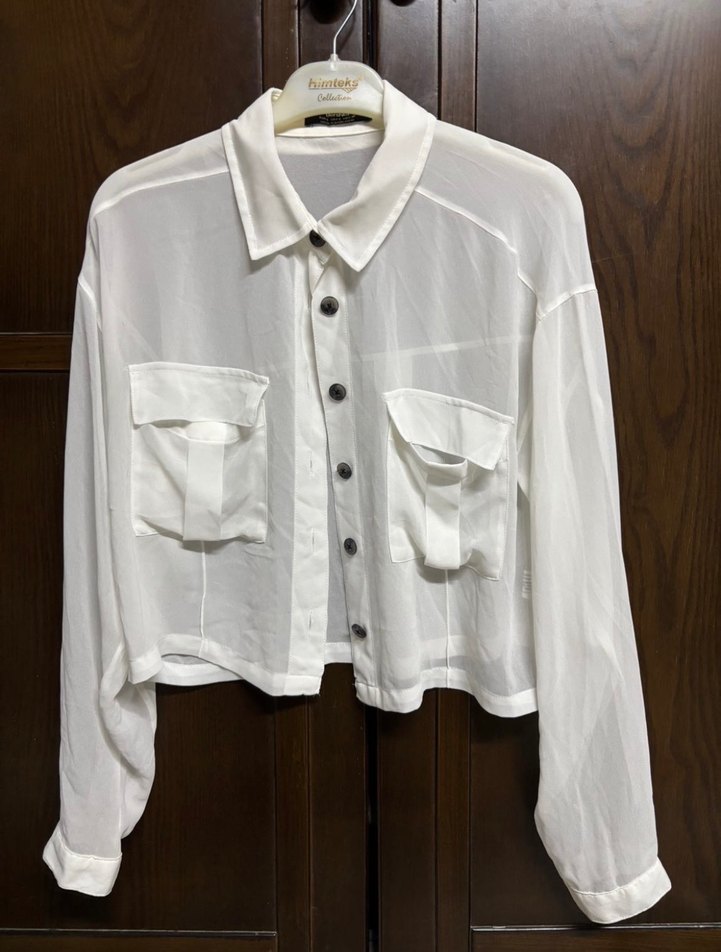 Uzun kollu, düğmeli, beyaz keten gömlek. Yaka detaylı ve iki cepli, rahat kesimiyle günlük kullanıma uygundur.
