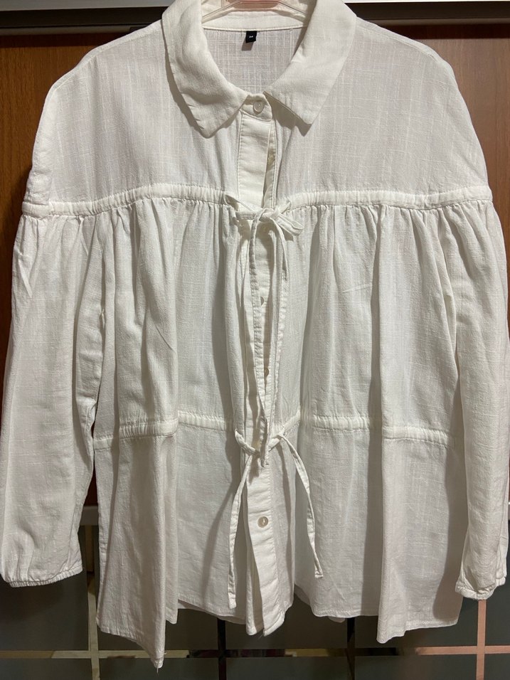 Düğmeli, yakalı, keten kumaştan yapılmış beyaz, bol kesim kadın gömleği. Strappy kollu ve bohem tarzda, günlük kullanım için uygundur.