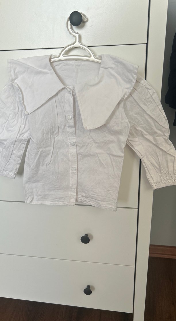 Beyaz keten kadın gömlek, yakalı, düğmeli ve kısa kolludur. Bol kesim ve normal uzunluktadır, günlük kullanım için sade ve rahat bir tarz sunar.
