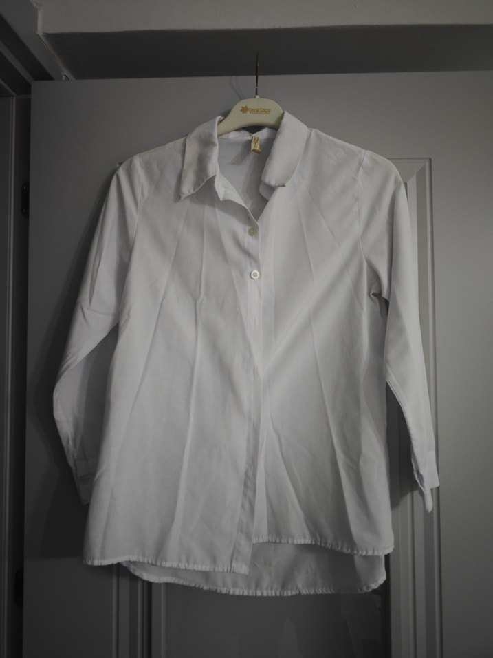 Düğmeli ön kısmı, yakalı ve kısa kollu, bol kesim beyaz keten kadın gömleği.
