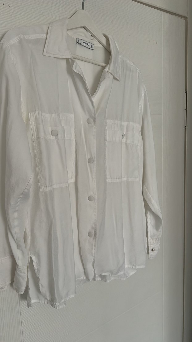 Beyaz keten kumaştan, düğmeli, uzun kollu, çıtçıtlı cepli, salaş kesim kadın gömleği. Minimalist ve günlük sokak stili için uygundur.