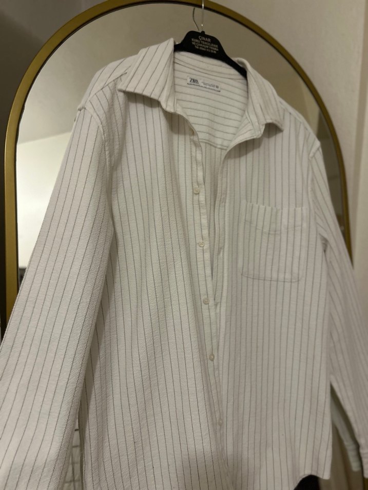 Beyaz keten erkek gömlek, uzun kollu, düğmeli, normal midi boyda ve regular fit. Ofis ve günlük kullanıma uygun, gri ince çizgili sade tasarım.