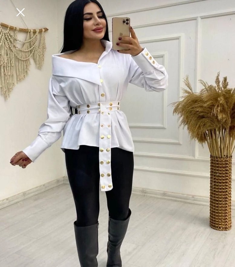 Beyaz keten kumaştan, düğmeli, yakalı ve uzun kollu, bol kesim kadın gömlek. Rahat ve sade günlük kullanım için uygundur. KEMERSİZDİR