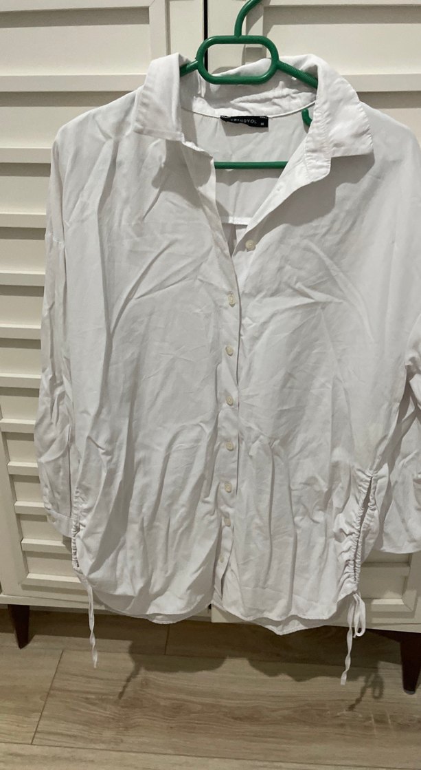 Düğmeli, yakalı beyaz keten kadın gömlek, kısa kollu ve midi boyda, rahat ve salaş kesimdir. Minimalist, gündelik tarz için uygundur.