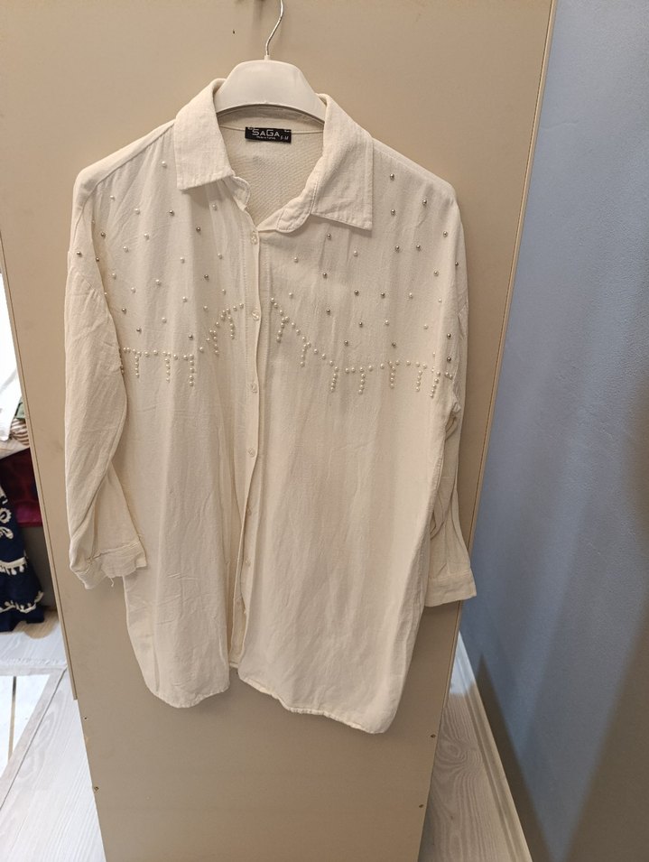 Düğmeli, uzun kollu beyaz keten kadın gömlek. Salaş kesim ve yakalı, günlük rahat sokak stiline uygun. çok az giyildi artık bana olmadığı için satıyorum