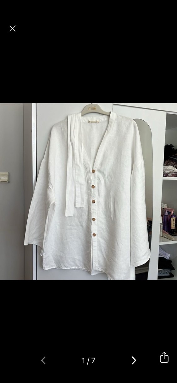 Düğmeli ön kısmı ve uzun kollu, rahat kesim beyaz keten gömlek. Minimalist bohem tarzda, halter yakalı, günlük kullanıma uygun. Hiç kullanılmadı. M/L büyük geldiği için satıyorum