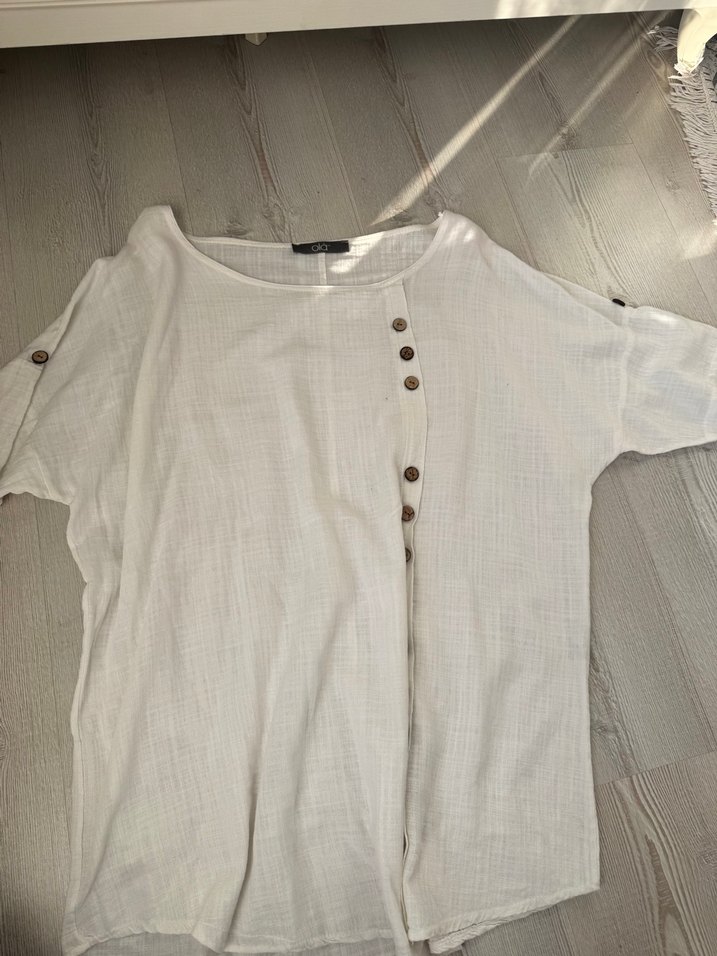 Düğmeli, keten kumaştan yapılmış beyaz kadın gömleği. Kayık yaka ve kısa kollu, bol kesim midi uzunlukta, günlük rahat kullanım için uygundur.