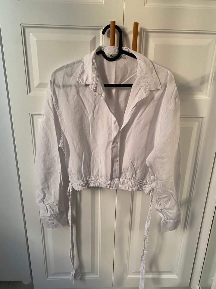 Beyaz keten kadın gömlek, yakalı, düğmeli ve uzun kolludur. Bağcıklı detayları ve bol kesimiyle midi boyda, günlük kullanıma uygundur.