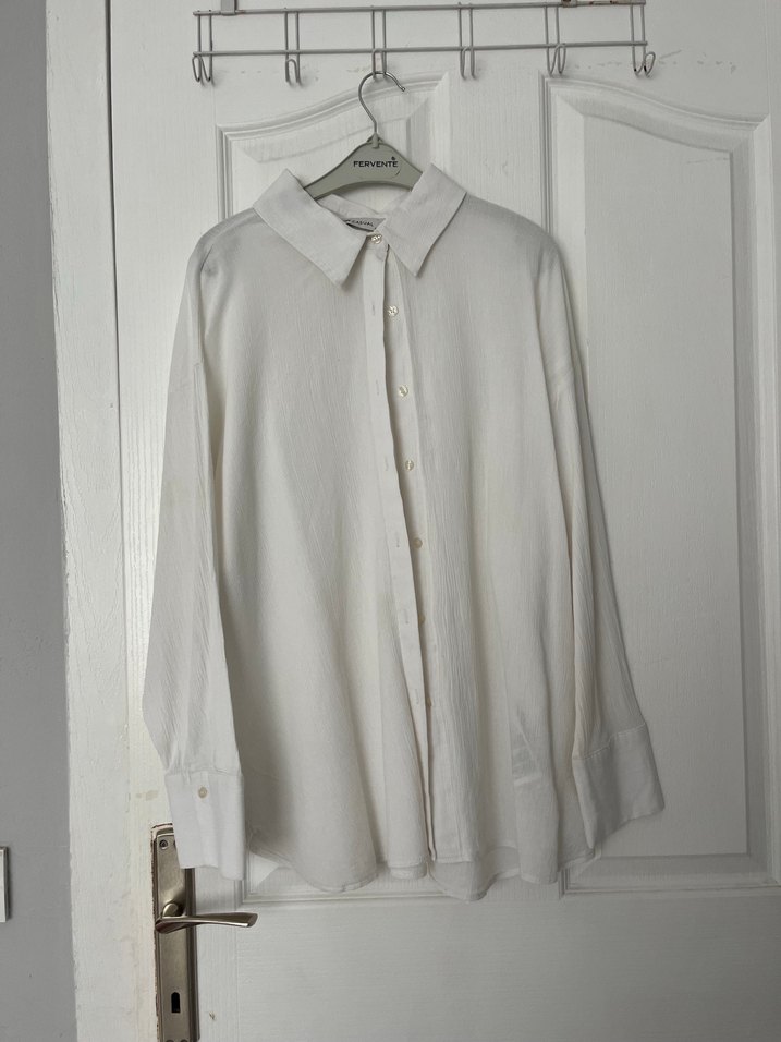 Düğmeli, uzun kollu keten kadın gömlek. Beyaz, normal boyda, bol kesim ve yakalı. Minimalist, desensiz ve sade tarzda, günlük kullanıma uygun.