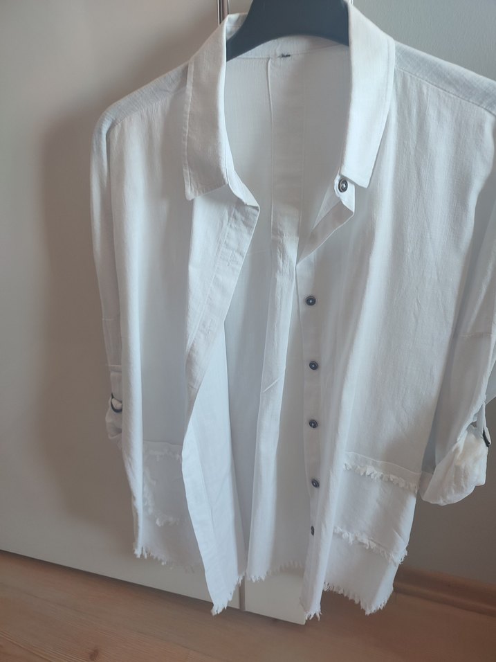 Düğmeli, uzun kollu, keten kumaştan yapılmış beyaz kadın gömleği. Salaş kesimi ve bohem tarzıyla günlük kullanıma uygundur.hic gymedim.ölçüleri görselde mevcuttur .spor,şık gomlek ceket tarzi vardır.badylerin üzerine giyilebilir.