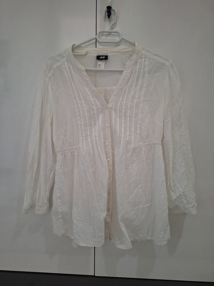 Düğmeli beyaz keten kadın gömlek, uzun kollu ve V yaka. Salaş kesimi ve midi boyu ile bohem tarzını yansıtır. Defosu yok