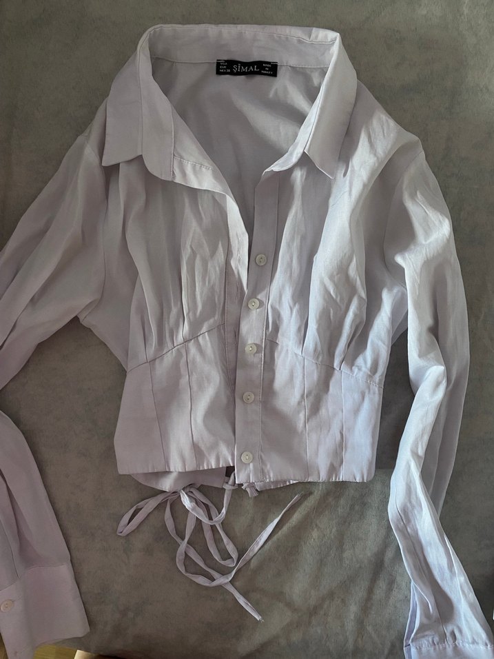 Beyaz keten kumaştan, düğmeli ve uzun kollu kadın gömlek. Yaka detaylı, beli oturan ve normal uzunlukta, ofis kullanımı için uygun.