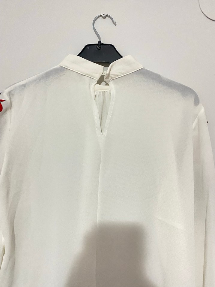 Düğmeli yakalı, uzun kollu beyaz keten gömlek. Salaş kesimi ve parlak dokusuyla ofis için uygundur.