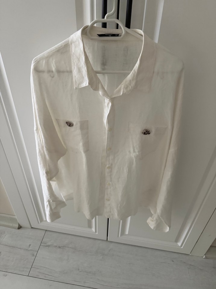 Düğmeli, beyaz keten kadın gömlek, yakalı ve uzun kolludur. Salaş kesimi ve düğmeli önüyle günlük rahat kullanıma uygundur.