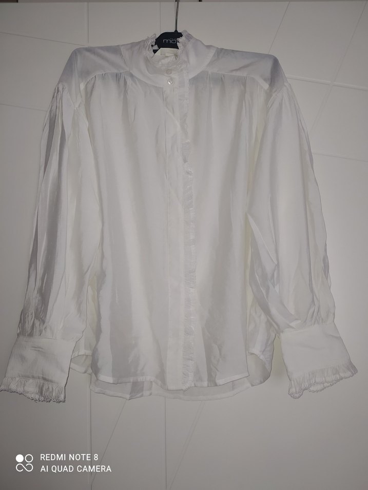 Beyaz keten kumaştan, düğmeli, uzun kollu, yakalı ve bol kesim midi uzunluğunda kadın gömlek. Ofis kullanımı için Paris sokak stili dokunuşlu.