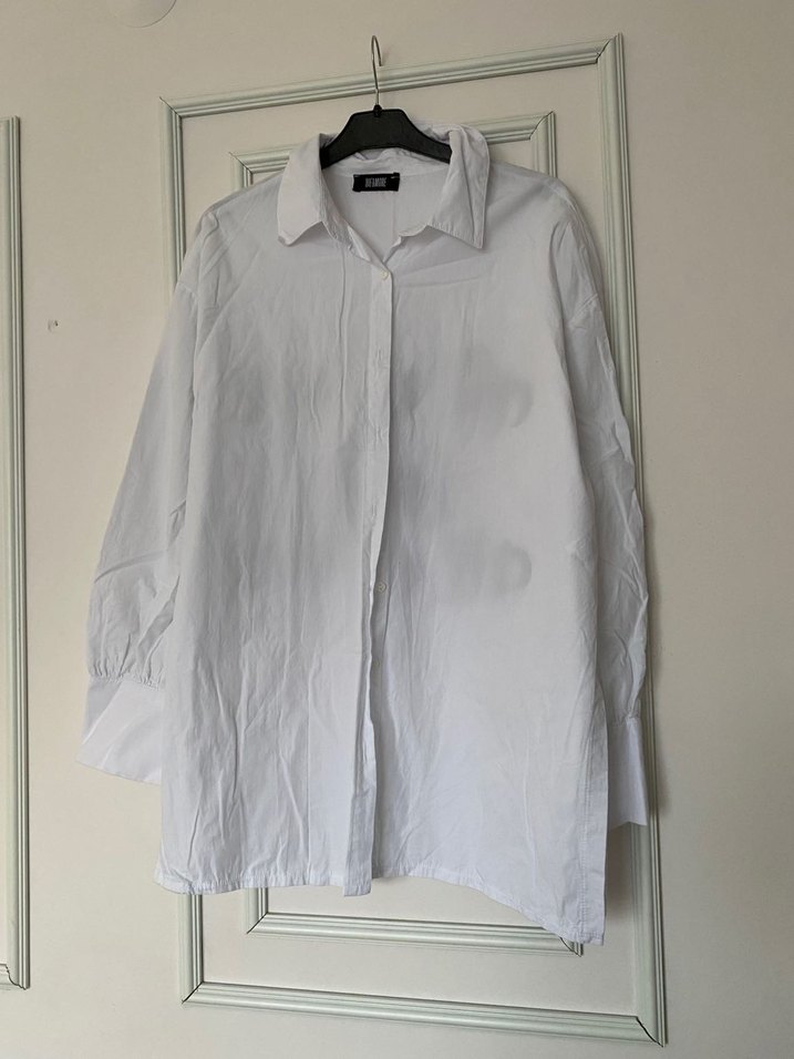 Uzun kollu, düğmeli beyaz keten gömlek. Bol kesim ve yakalı, minimalist tarzda, günlük kullanıma uygun.
