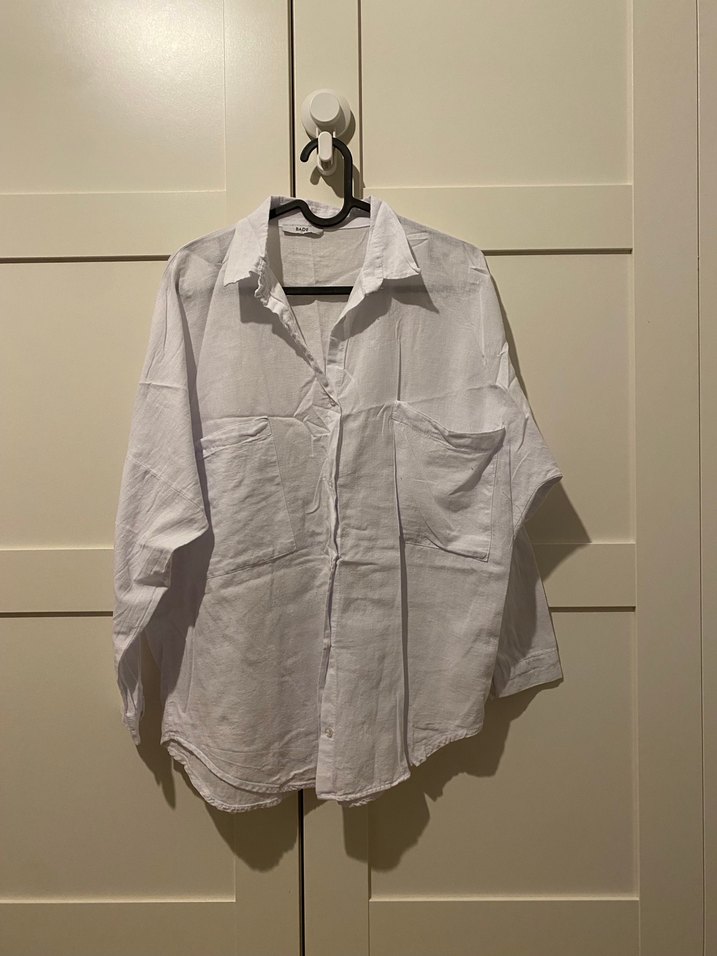 Düğmeli, uzun kollu, yakalı beyaz keten kadın gömleği. Salaş kesimi ve normal midi boyuyla günlük kullanıma uygundur. Casual tarzda sade ve şık bir parça.