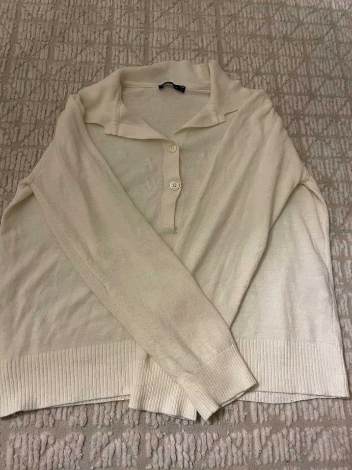 Beyaz keten kumaştan, düğmeli, yakalı, uzun kollu, bol kesim ve midi boyda kadın kazak. Rahat ve şık sokak tarzı için uygundur.