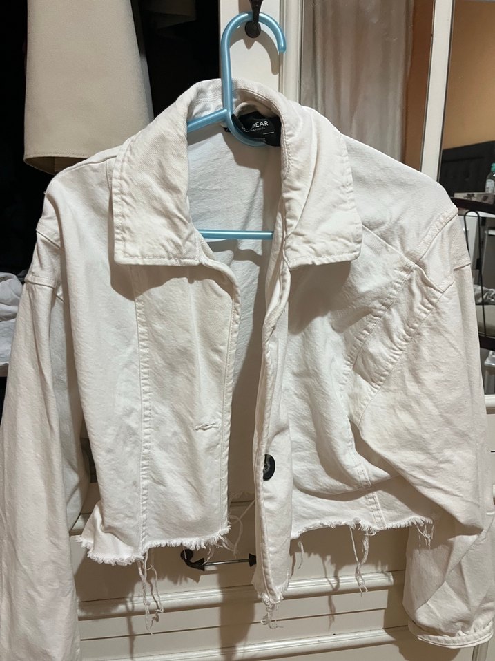 Uzun kollu, düğmeli beyaz keten kot ceket, salaş kesim ve yıpratılmış etek ucu ile rahat bir görünüm sağlar. Günlük kullanım için uygundur.