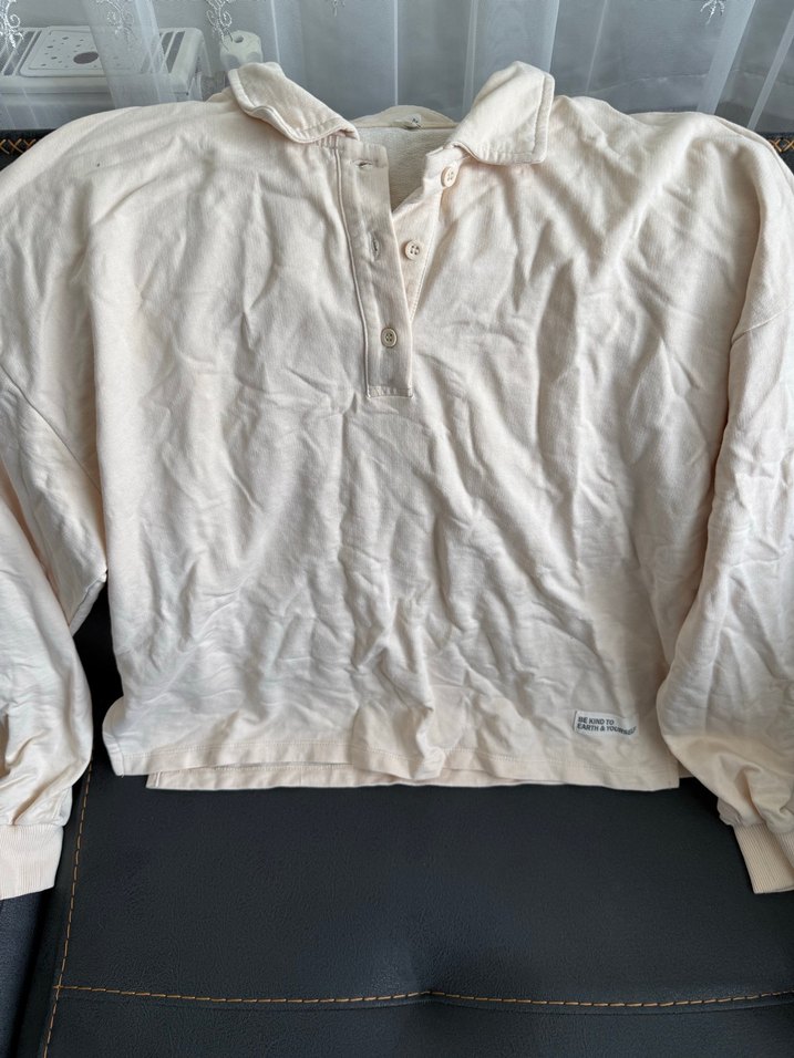 Düğmeli önü, yakalı ve uzun kollu keten kumaştan yapılmış, bol kesim beyaz kadın sweatshirtü. Günlük rahat sokak stili için ideal, sade ve temel tasarım.