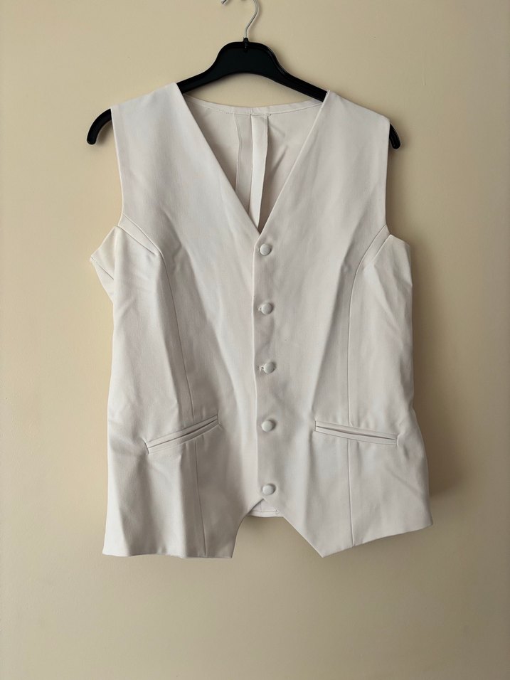 Düğmeli, keten kumaştan yapılmış beyaz, kolsuz kadın yelek. Normal uzunlukta ve regular fit. Ofis ve günlük şıklık için uygun, Paris tarzında.