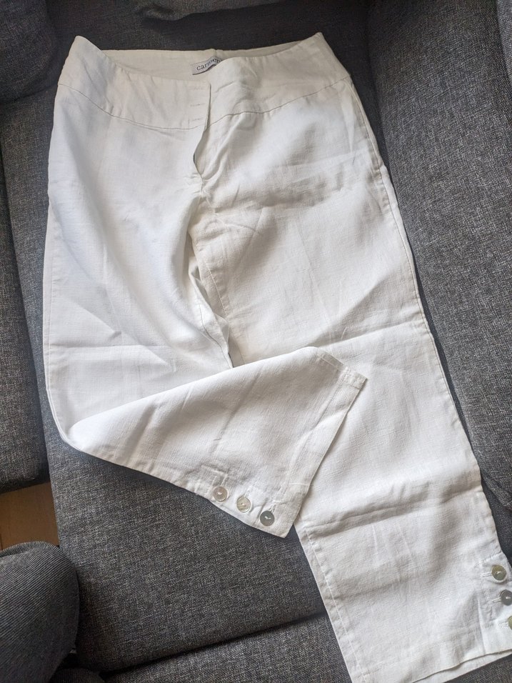 Düğmeli detaylara sahip, midi boy beyaz keten pantolon, rahat ve günlük kullanıma uygun.
