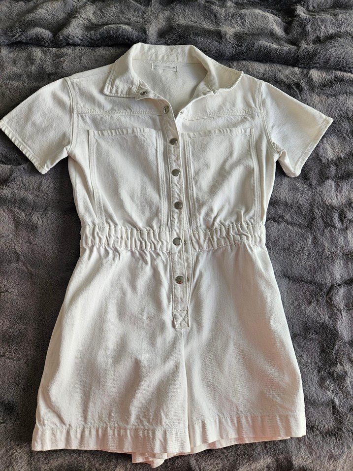 Düğmeli, yakalı ve kısa kollu beyaz keten tulum. Bel kısmı büzgülü, rahat ve şık günlük kullanıma uygun.