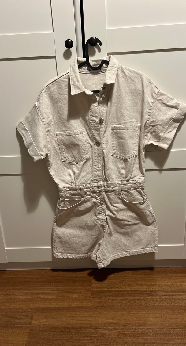 Beyaz keten kısa tulum, düğmeli, yakalı, kısa kollu ve bol kesimdir. Ön cepleri bulunur, günlük sokak stili için uygundur.
