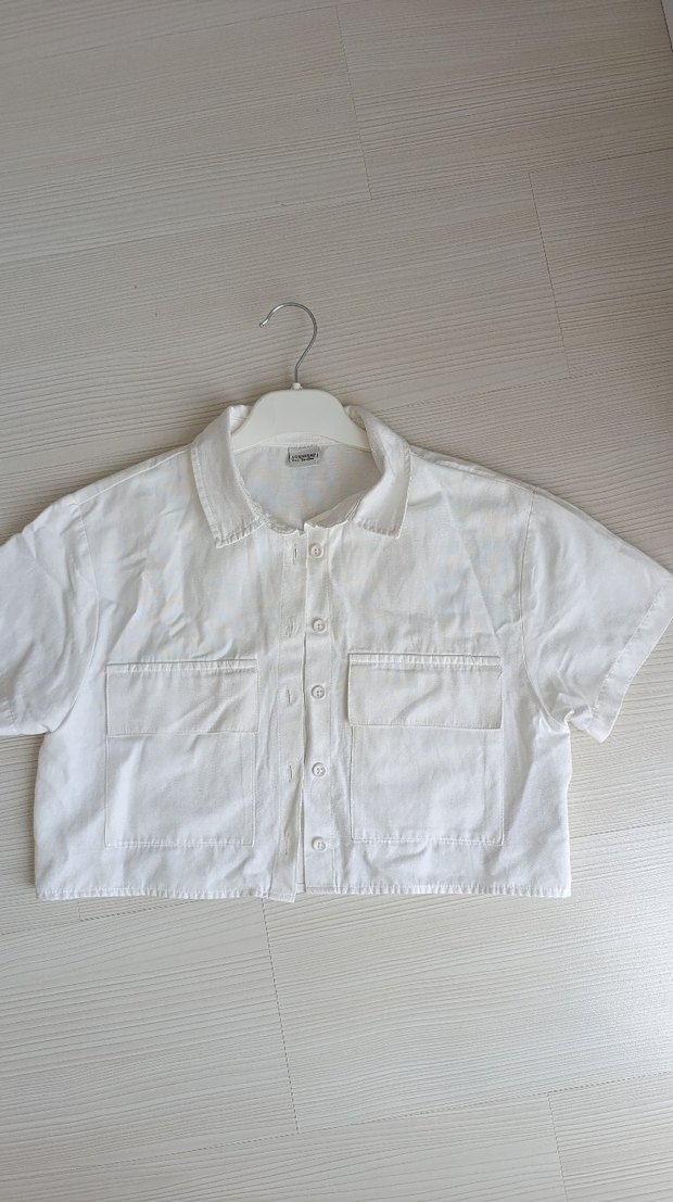 Beyaz keten kumaştan, kısa kollu, düğmeli, yakalı ve iki ön cepli, bol kesim kadın gömleği. Minimalist sokak tarzına uygun.