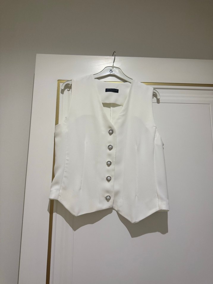 Kolsuz beyaz keten yelek, düğmeli ve keskin yaka detaylıdır. Klasik Paris tarzıyla ofis için ideal, kısa ve rahat kesimdir. Kumaşı krep