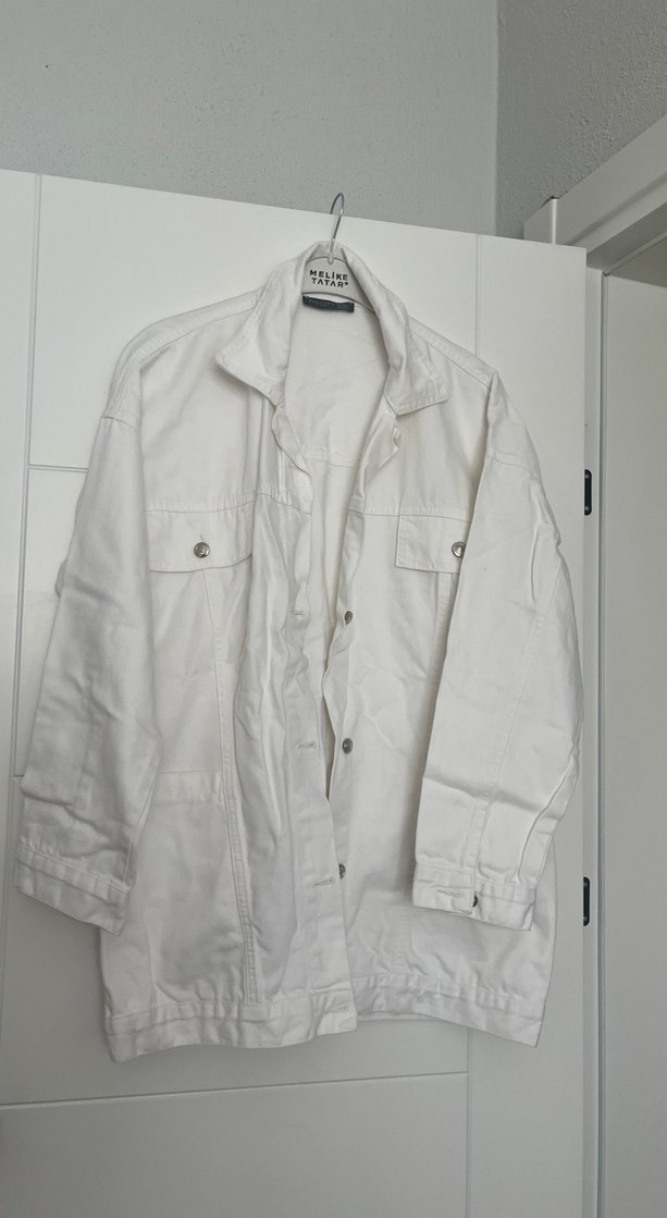 Düğmeli, keten kumaştan beyaz midi ceket, notalı yaka ve uzun kollu. Rahat kesimiyle gündelik sokak stili için uygun.