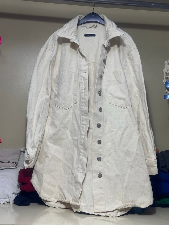 Düğmeli, keten kumaştan beyaz midi ceket, notched yaka ve uzun kollu. Rahat kesimiyle günlük sokak stiline uygundur.