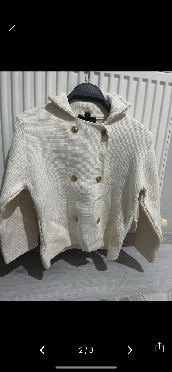 Düğmeli beyaz keten ceket, uzun kollu ve kesik yaka detaylıdır. Gevşek kesimi ve midi boyuyla rahat sokak stiline uygundur.