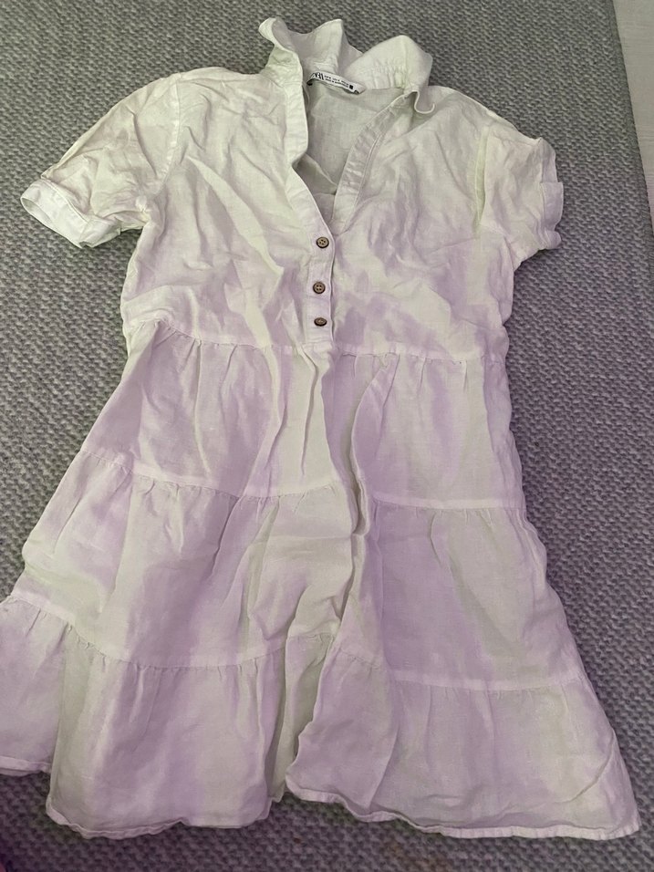 Düğmeli, yakalı, kısa kollu, bol kesim beyaz keten midi elbise. Günlük kullanım için bohem tarzda rahat bir model.