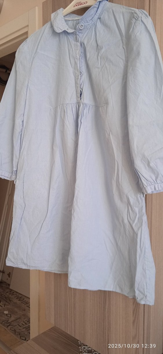 Beyaz keten gömlek, düğmeli, yakalı ve yetim kollu. Salaş kesim, midi boyda, minimalist günlük stil için uygun.boy 77 cm iki kol arası 46 cm
