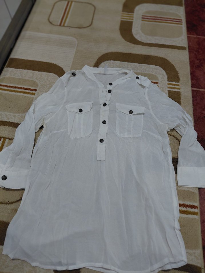 Beyaz keten midi gömlek, düğmeli ve iki cep detaylıdır. Uzun kollu, yakalı ve bol kesimdir, günlük bohem tarz sunar.