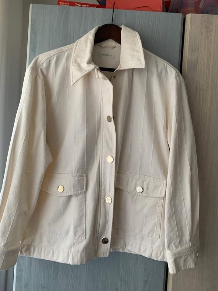 Düğmeli, keten kumaştan beyaz midi boy kadın ceket. Uzun kollu ve normal kesim, günlük rahat kullanım için uygundur.