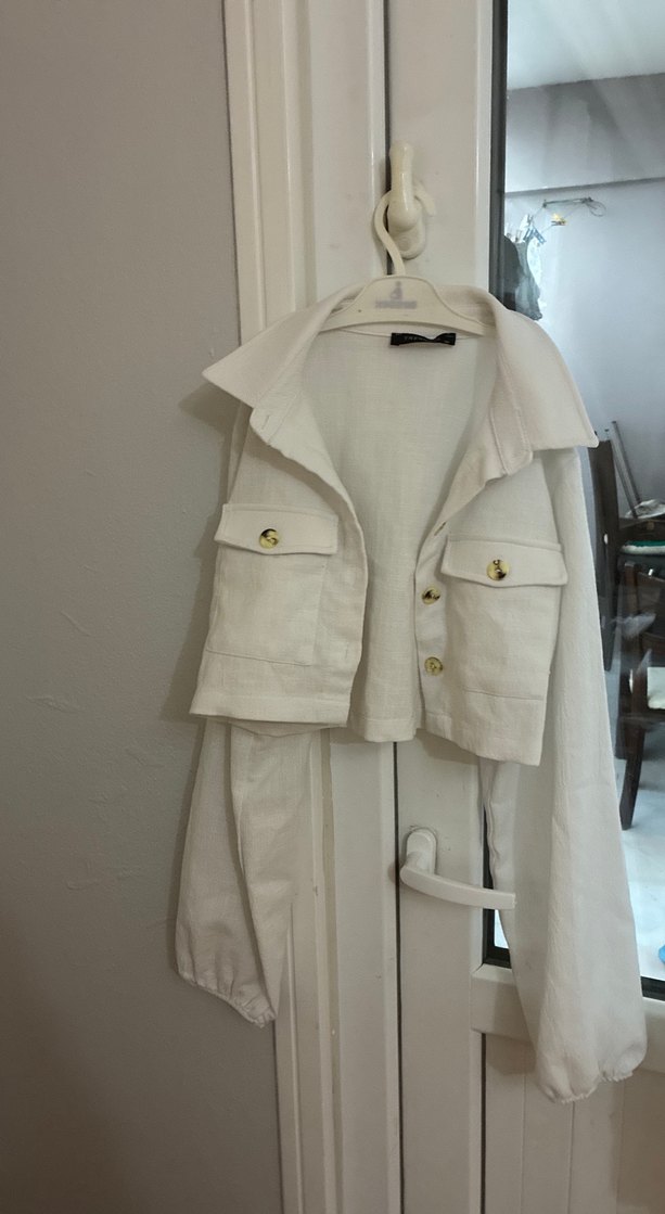 Beyaz keten gömlek, düğmeli cep detayları ve kesik yaka ile dikkat çekiyor. Uzun kollu, bol kesim ve midi boyda, günlük kullanıma uygun şık bir parça.