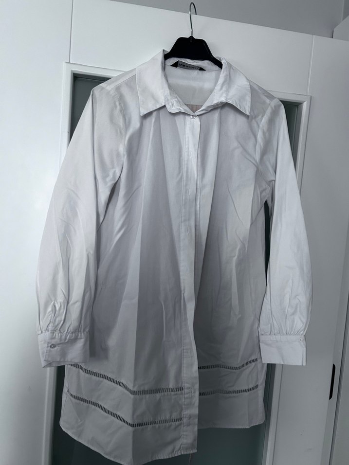 Düğmeli, uzun kollu ve yakalı beyaz keten kadın gömleği, bol kesim ve etek kısmında hafif süslemelerle. Günlük kullanım için uygundur.
