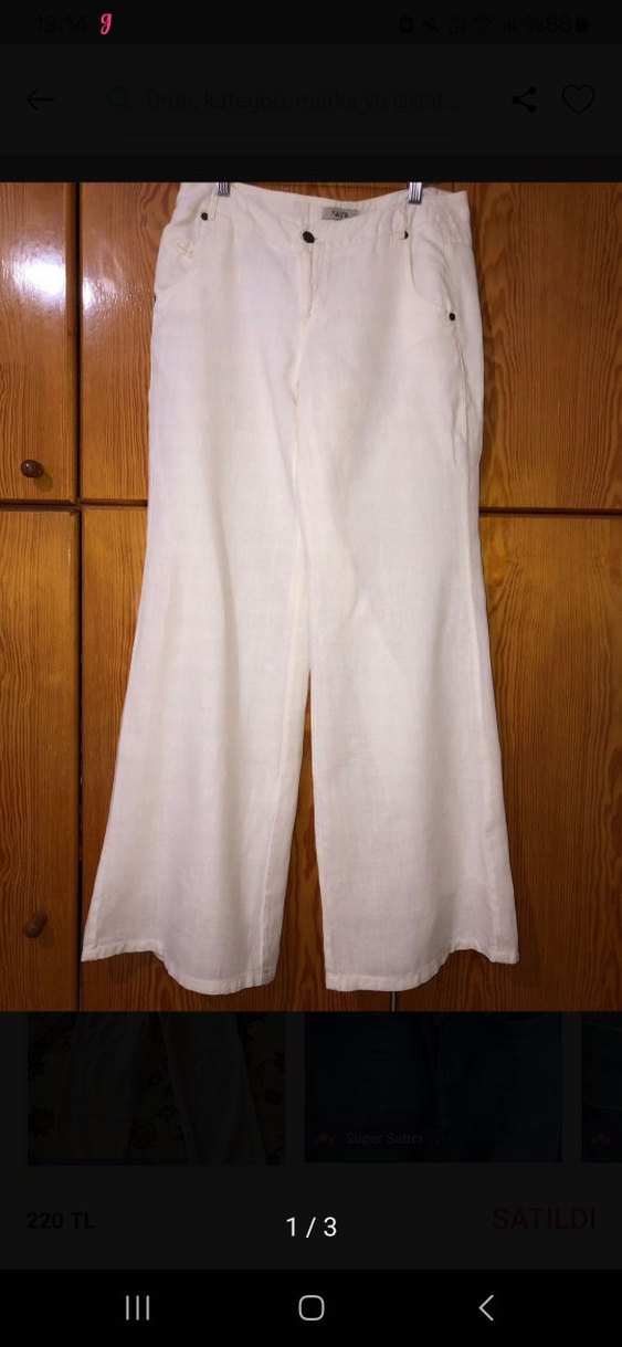 Düğmeli detaylı, normal boy beyaz keten pantolon. Minimalist ve bohem tarzda, günlük kullanıma uygun.