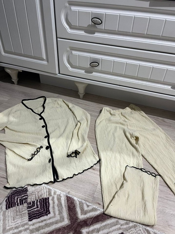Düğmeli beyaz keten kadın takım, normal kesim, uzun kollu ve yakalıdır. Midi boy pantolon ve bohem tarzıyla günlük kullanıma uygundur. Hafif renkli ve desensizdir.