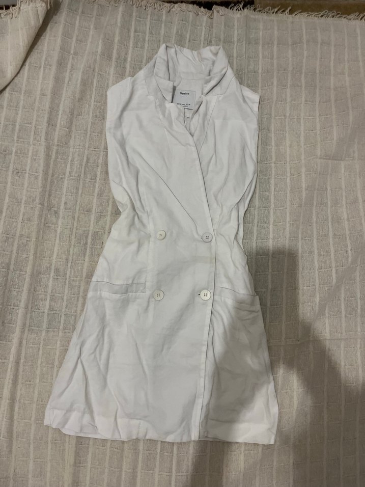 Düğmeli, keten kumaştan beyaz, kolsuz midi yelek Notlu yaka ve normal kesimle günlük kullanıma uygun minimal ve normcore tarzda. Dolapta durduğu için ütüsüz