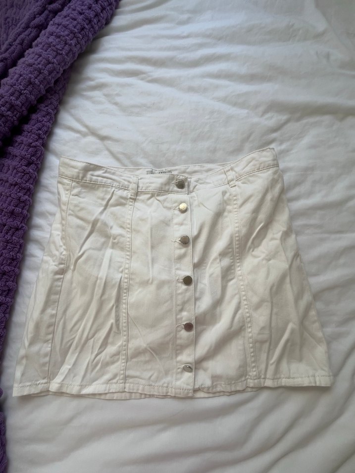 Düğmeli ön kısmı ve bol kesimi ile beyaz keten midi etek, günlük sokak tarzı için minimal bir şıklık sunar.