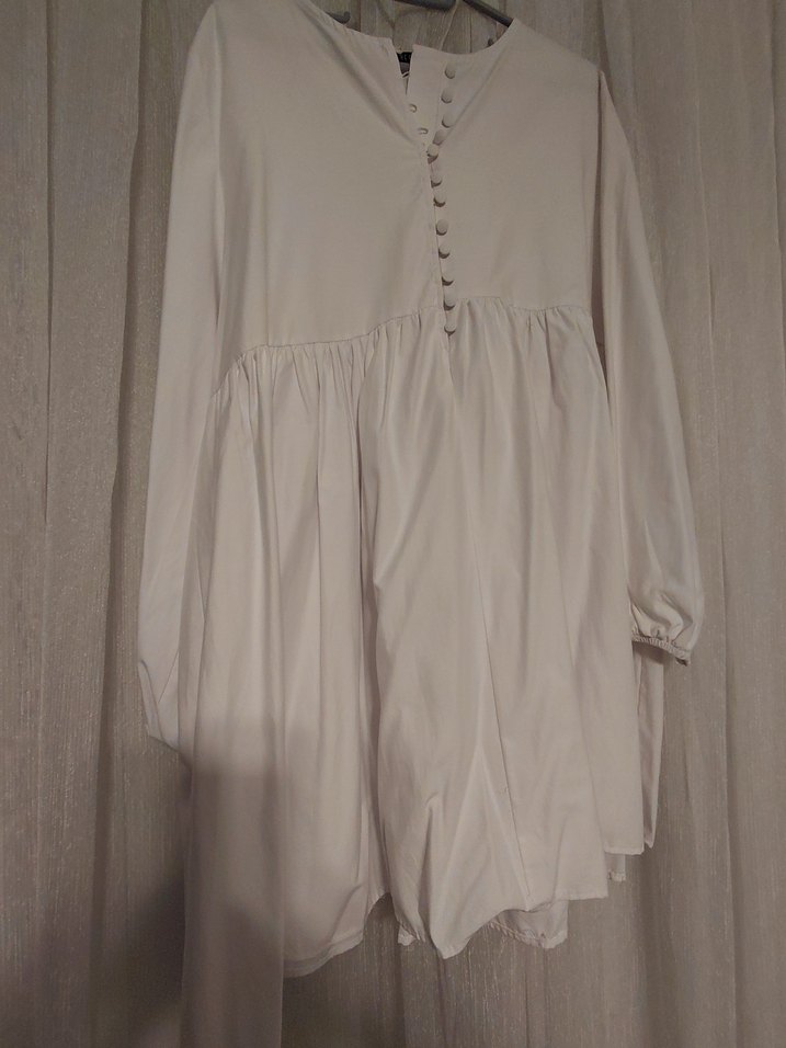 Düğmeli, uzun kollu, V yakalı beyaz keten tunik. Rahat kesimi ve midi boyu ile bohem tarzı yansıtır.